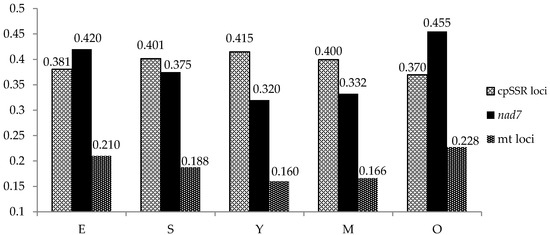 Figure 1. Haplotype diversity among age classes for chloroplast and mitochondrial markers. E—embryos germinated from seeds; S—seedlings 1–3 years old; Y—young trees 10–20 years old; M—middle-aged trees 40–80 years old; O—old trees above 100 years.