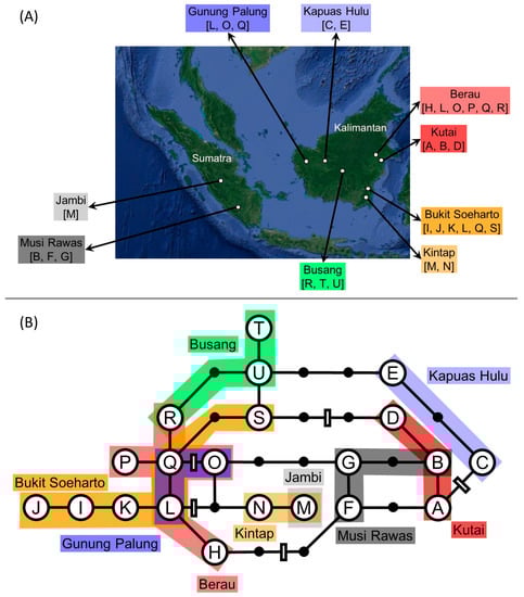 (A) Locations of population from where Eusideroxylon zwageri samples were collected on the Kalimantan and Sumatra islands. The letters in square brackets represent the detected chloroplast haplotypes at each location. (B) Statistical parsimony network of the 21 detected chloroplast DNA haplotypes. The solid circles denote missing or unsampled haplotypes. Each solid line without and with rectangle between the haplotypes and (or) solid circles represents a nucleotide substitution and sequence inversion, respectively. Haplotypes highlighted by the same colors are derived from the same locations.