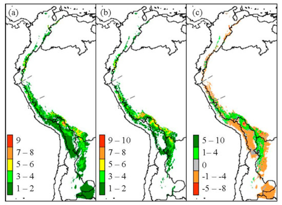 Past (a), present (b), and overall change (c) of Polylepis species richness predicted with Community Climate System Model (CCSM) global circulation model. Overlaying the ≥50% probability of each species predicted distribution was used to estimate richness.