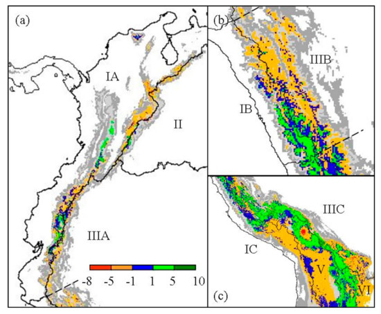 Regional change of Polylepis species richness for (a) North Andes (IA), Orinoco (II), and North Amazon (IIIA); (b) West and East Jalca (IB, IIIB); and (c) the southern zones of Central Andes (IC), South Amazon (IIIC), Altiplano (V), and Paraná (VI). Refugial areas are highlighted in blue. Present elevation greater or equal to 1000 m is indicated in gray scale.