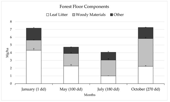 On the day when the litterbags were set in the field (January 2015) the overall forest floor was 7.18 ± 0.90 Mg/ha, composed mainly of leaf litter (60% of the total) and an equal contribution of woody material and other materials (i.e., mostly fern and other understory residues). In the following months, namely May and July, corresponding to 100 and 180 decomposition days, the forest floor decreased down to 4.06 ± 0.57 Mg/ha, with a sharp decrease of leaf litter and an increase of woody material contribution. In October 2015, corresponding to 270 days of decomposition in the litterbag experiment, the forest floor was 7.26 ± 0.98 Mg/ha, with a prevalence of woody materials over leaf litter (50 vs. 30%, respectively). During the whole study period, other materials accounted for roughly 20% of the forest floor.