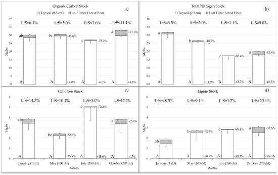 Dynamics of organic carbon (a), total nitrogen (b), cellulose (c) and lignin (d) stocks in the forest floor leaf litter (upper grey bars) and topsoil (lower white bars). Each bar is accompanied by the relative increase or decrease in the stock compared to January. The presence of significant differences between sampling per compartment was tested by the mean of a one-way ANOVA followed by a Tukey post-hoc test. Such differences are shown as lowercase letters for forest floor leaf litter and uppercase letters for topsoil. Bars which do not share a letter have significant differences (p < 0.05). At the top of each graph, the ratio between the stocks in the forest floor leaf litter and topsoil is shown. Months and decomposition days in the litterbag experiment (dd) are reported. L:S indicates the ratio between the stock in leaf litter forest floor and the topsoil.