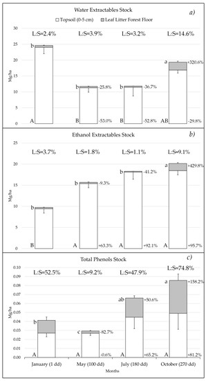 Dynamics of water extractable (a), ethanol extractable (b) and total phenol (c) stocks in the forest floor leaf litter (upper grey bars) and topsoil (lower white bars). Each bar is accompanied by the relative increase or decrease in the stock compared to January. The presence of significant differences between sampling per compartment was tested by the mean of a one-way ANOVA followed by a Tukey post-hoc test. Such differences are shown as lowercase letters for forest floor leaf litter and uppercase letters for topsoil. Bars which do not share a letter have significant differences (p < 0.05). At the top of each graph, the ratio between the stocks in the forest floor leaf litter and topsoil is shown. Months and decomposition days (dd, in parentheses) in the litterbag experiment are reported. L:S indicates the ratio between the stock in leaf litter forest floor and the topsoil.