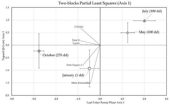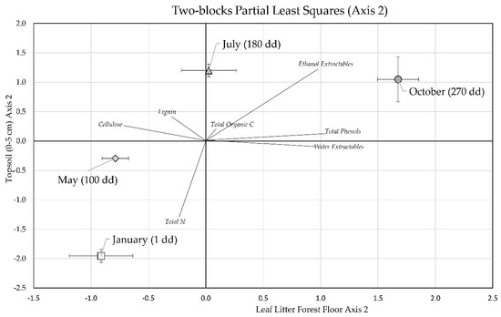 The first axis of the two-block PLS allowed us to summarize that, in the 270 days of observation, in the forest floor leaf litter from January to July there was a reduction of total N, lignin and cellulose and, in the topsoil, a decrease of water extractables and total organic carbon, with a corresponding increase in cellulose. The aforementioned dynamics reversed from July to October, although the degree of variation was higher for forest floor leaf litter than for the topsoil. The second axis, in contrast, put forward information about total phenols and ethanol extractables, which were inversely correlated with cellulose and total N stock, highlighting a clear pattern of variation for these stocks between seasons.