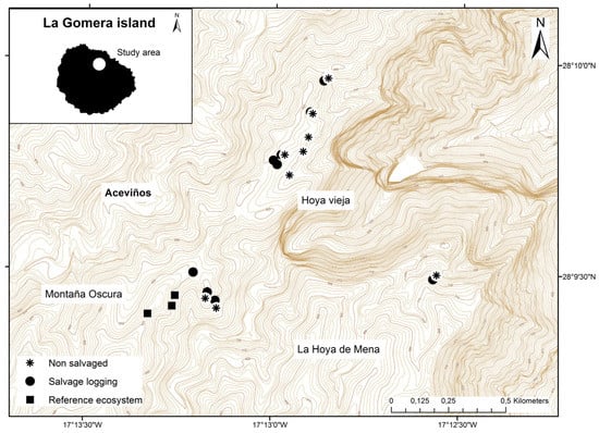 The study area is located in the northeast of La Gomera (Canary Islands; 28°06′ N 15°24′ O), where a human-caused wildfire took place in April 2008. Fires on the Canary Islands occur mostly in pine forests, being mature laurel forests not particularly fire prone [39]. Most of them have an anthropic origin (whether by negligence or provoked), representing natural fires only a 0.8% [40]. In April 2008, a total of 511 ha were severely affected by a fire from 200 to 890 m above sea level (m a.s.l. hereafter), encompassing banana plantations and abandoned agricultural areas on the lowlands, and the laurel forest areas situated above 750 m a.s.l., being those forest areas where plots were established. Fifteen months after the fire, the local Forest Service created a matrix of plots where post-fire salvage logging was conducted, intermingled with plots without salvage logging. This provided the opportunity to set up an experiment with two levels of post-fire wood management (treatments hereafter), being: (1) Salvaged logging (SL), where all trees were manually cut and removed, and most of the coarse woody debris was removed also manually and left near the roads; and (2) Non-salvaged (NS), where no post-fire action was undertaken. In addition, we considered a third treatment; (3) Reference ecosystem, covering areas of nearby forests that were not burnt. The reference ecosystem was composed by a dense, native 50-year-old forest dominated by Erica arborea, Morella faya and Ilex canariensis [41], with a dominant tree height of circa. 12 m (Table 1). The bioclimatic belt of the area corresponds to subhumid pluviseasonal lower-mesomediterranean, influenced by trade-wind clouds [42]. The mean annual temperature is 13.7 °C, mean minimum of the coldest month is 5.8 °C, mean maximum of the coldest month 13.2 °C, and the annual rainfall is 683 mm (period 1960–2002; climatic data from the “Agulo-Meriga Vivero” meteorological station, placed at circa. 2 km from the study site at 840 m a.s.l. [42]).