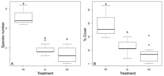 Box plots of species richness (A) and abundance (% cover) (B) of bryophytes on the three transects. Different superscript letter denote significant differences after post hoc comparisons (p < 0.001).