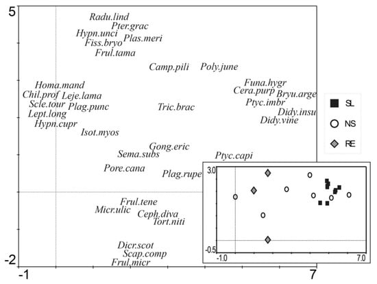 The Indicator Species Analysis performed with “indicspecies” showed three indicator species for SL plots: Ptychostomum imbricatulum (Indicspecies statistic = 0.963, p-value = 0.0001), Didymodon vinealis (0.821, p-value = 0.05), and Funaria hygrometrica (0.779, p-value = 0.05). By contrast, no indicator species were found for NS plots. SIMPER analysis provided additional information on the species that contributes more to similarities within plots of each treatment (Table 3). Results of SIMPER for SL plots agree with those found with the Indicator Species Analysis, revealing again P. imbricatulum, D. vinealis and F. hygrometrica as the species accounting for most of the similarity of the plots, together with Ceratodon purpureus. Among the species representative of RE are Frullania teneriffae, F. tamarisci, Porella canariensis (liverworts), and Hypnum uncinulatum and Plasteurhynchium meridionale (mosses), which are mostly epiphytes. For NS plots, the results show a species list similar to that found for SL plots, with terrestrial and colonists species such as C. purpureus, C. pilifer, or P. imbricatulum, although we can find that some perennial epiphytes appear, such as Hypnum cupressiforme.