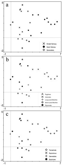 Detrended correspondence analysis (DCA) showing the distribution of all bryophyte species found in the plots classified by (a) canopy preference; (b) life strategy; and (c) substrate preference.