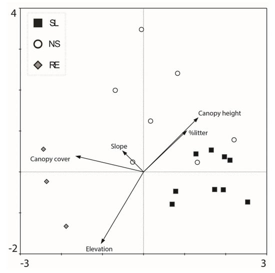 Canopy cover, litter layer, and height of the resprouted vegetation differed sharply among treatments, and in all cases showed an increase from SL to RE (Table 1). The depth of the litter layer did not differ across treatments, but similarly showed a trend that increased from SL to RE (Table 1). Finally, the height of the resprouted vegetation was higher in NS than in SL treatments (Table 1).
