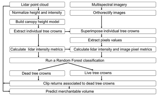 12]. However, we did not find any study demonstrating the ability of lidar sensors to detect dead trees for sites with low mortality where, for example, only natural mortality is observed. Yet, accurate information on live trees alone (e.g., merchantable volume MV, live biomass) are mandatory in an operational context as they are directly linked to the economic value of timber. Improved estimates of tree mortality are also fundamental for a sustainable forest management. There is, therefore, a need to investigate the contribution of lidar and multispectral imagery when predicting live tree attributes in high and low mortality contexts.