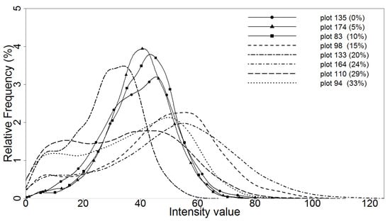 Figure 3 shows that plots with different mortality ratios have different lidar intensity distributions. The importance of lidar intensity for the identification of dead trees has often been studied in forests where dead trees are abundant, such as in high mortality sites [