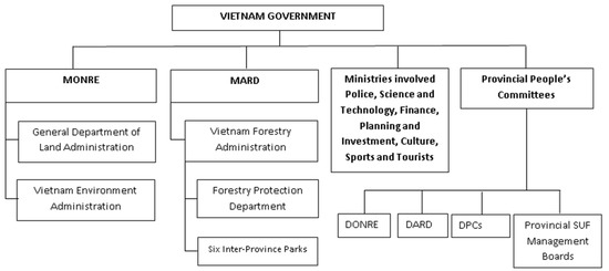 The national legal and policy framework for SUFs is hierarchical and fragmented, spread across a range of laws, ordinances, decrees, circulars, directives, and decisions to impart legal instruments [11]. As illustrated in Figure 1, the Ministry of Agriculture and Rural Development (MARD) and the Ministry of Natural Resource and Environment (MONRE) are the two executive branches of government responsible for the management of forest, forest resources, and forestlands. Under MONRE, the General Department of Land Administration is responsible for the enforcement of the forestland law. MARD and the Vietnam Administration of Forestry and Forest Protection Department is responsible for consultation and legitimately enforcing forest and forest resource protection across the country, as well as concurrently managing six inter-provincial national parks (Cuc Phuong, Tam Dao, Ba Vi, Yok Don, Cat Tien, and Bach Ma) (Decree 119/2006/ND-CP). MARD is also responsible for most aspects of SUF management, including the establishment, policy review and adjustment, management supervision and resource inventorization (Decree 117/2010/ND-CP).