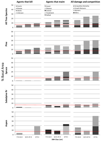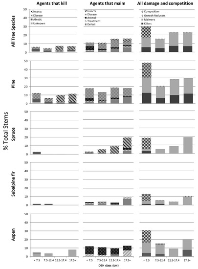 Based on simple tree counts across all management units, tree species and diameter classes, 17.7% of sampled trees were damaged beyond established criteria (Table 5). These trees are unlikely to reach rotation age (due to agents that kill) or are so damaged they would be culled at time of harvest or have significant losses in milling operations (due to agents that maim) [32]. The majority (65%) of damaged trees ≥7.5 cm dbh were affected by agents that maim, including scarring from animal feeding, forks and broken tops due to abiotic events such as heavy snowfalls, forking caused by insect feeding on tree leaders and disease induced defects including western gall rust stem infections. Since maiming agents do not typically kill larger trees, their incidence in stands tends to increase over time.