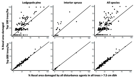 The percent of lodgepole pine, interior spruce and all tree species combined basal area (m2/ha) that is damaged in the largest diameter 100 and 800 stems per ha in contrast to the percent of basal area that is damaged for the entire sample (all pine, spruce or all tree species combined ≥7.5 cm dbh). If the point is above the 1:1 line, it indicates that cohort of trees have more damage than the entire sample and if below they have less. Each point represents an individual stand.