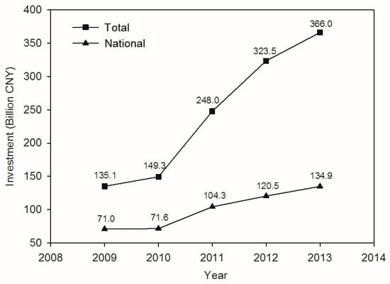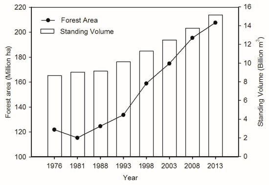 According to the 8th National Forest Resource Inventory (2009–2013) [17], the total area of forestland in China is 310 million ha. Forty percent of the forestland is owned by the state, and 60% is owned by collectives. Forested land area in China is 207.69 million ha, and the standing volume of timber is 15.14 billion m3. Since the first forest resource inventory in 1976, the standing volume has increased from 8.66 billion m3 to 15.14 billion m3 [17]. Forest area decreased from 121.86 million ha to 115.28 million ha between the first and the second national forest resource inventories. Thereafter, it increased steadily from 115.28 million ha in 1981 to 207.69 million ha in 2013 (Figure 1). Ecosystem protection is becoming more and more important in China’s forest policy. To increase forest coverage and the volume of standing timber and to enhance the carbon sequestration capacity are top priorities of the forestry sector. The planting area within four key forestry programs (the Natural Forest Protection Program, the Sloping Land Conversion Program, the Desertification Combating Program around Beijing and Tianjin, and the Shelterbelt project) was 1.93 million ha in 2014, accounting for 34.74% of the total planting area in 2014 [18]. Investment in China’s forestry sector is growing (Figure 2). During 2009–2013, the total investments grew from 135.1 to 366 billion CNY, and the public investments raised from 71 to 134.9 billion CNY (1 CNY = 0.1439 USD as of 21 December 2016).