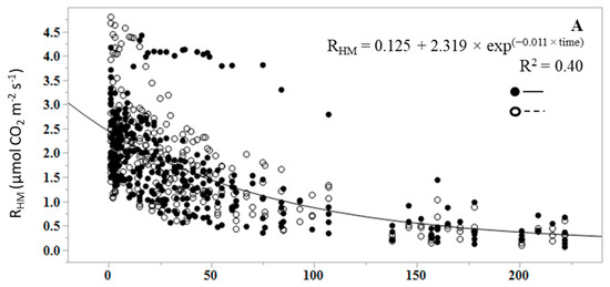 Soil cores did not receive a wetting event, as they were near field capacity (between 32 and 45 percent volumetric water content) [47,48] at the start of the dry down. Volumetric water content was estimated using a 12-cm HydroSense soil-water sensor (Campbell Scientific USA, Logan, UT, USA) at the time of core extraction, and by converting GWC to VWC (volumetric water content) by multiplying GWC by the bulk density of soil (site-wide mean bulk density from 0–30 cm depth was 1.32 ± 0.16 g cm−3) divided by the density of water (assuming 1.0 g cm−3) [49]. RHM and weight measurements began after the initial 48-h equilibration period following sample collection, and continued until the respiration rates were near zero, or reduced by 95% from the peak measurement rate. The duration of the RHM dry down to achieve near-zero rates varied by core but ranged from 200 to 223 days.