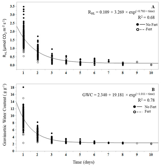 Change in (A) litter heterotrophic respiration (RHL) and litter water content (B) following the initial wetting event over the duration of the dry down (days) in unfertilized (closed symbols) and fertilized samples (open symbols). The line represents the fit of the exponential decay function. Data represent actual values for each replicated treatment.