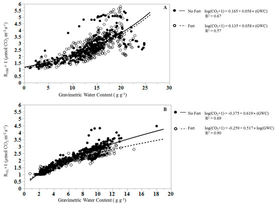 The regression of RHL on GWC differs between fertilized and unfertilized plots (Figure 3) as the slopes of the regression equations differed significantly (p < 0.0001; e.g., 0.619 for unfertilized and 0.517 for fertilized RHL), and the mean response for fertilization differs at zero (p < 0.0001; e.g., intercepts of −0.375 for unfertilized and −0.259 for fertilized RHL). The mean RHL differs by treatment (p = 0.009), with lower mean RHL in fertilized treatments (0.93 ± 0.040 µmol CO2 m−2 s−1) than in unfertilized treatments (1.27 ± 0.042 µmol m−2 s−1).