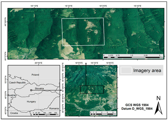The study site is located within the Kremnica Mountains in the middle of Slovakia (Figure 1) and is a part of the University Forest Enterprise of Technical University in Zvolen. Windthrow Žofia hit the site on 15 May 2014. It is considered the second largest windthrow in the last 20 years with a damaged volume of 4,072,279 m3 [6]. The forest stands that cover the study site consist mainly of European beech (Fagus sylvatica, L.), European silver fir (Abies alba, L.) and Sessile oak (Quercus petraea, L.). The whole study site area covers approximately 200 hectares and intersects 40 forest stands. The size of the site was estimated based on the UAS capability used to acquire imagery during one flight, while the location was chosen with regards to capturing at least two separate windthrow outbreaks.