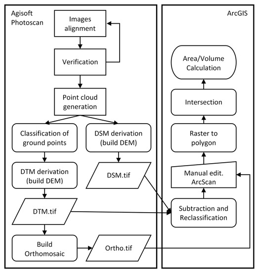 The workflow diagram of the imagery data processing to the final area and volume estimation conducted within the Agisoft Photoscan software [37] and ArcGIS 10.2 software [34].