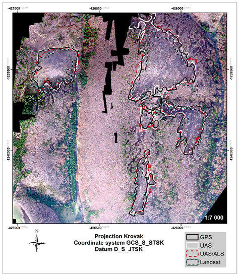 The five windthrow areas and extents were successfully identified by all presented methods (UAS, UAS/ALS, and Landsat method), with reference data (GNSS measurements), as shown in Table 1. The sum of the areas varied from 19.8 ha (Landsat) to 25.56 ha (UAS/ALS).