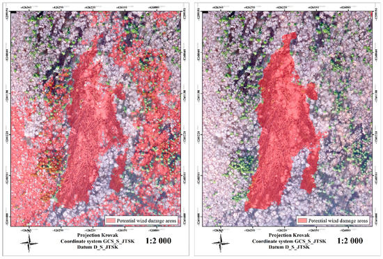The potential for increasing the efficiency of data collection could benefit unmanned aircraft systems (UAS), which can provide more accurate and detailed data compared to existing remote sensing techniques [20]. UAS are characterised by high accuracy, flexibility, and the ability to be used in different atmospheric conditions [27]. UAS have been employed in several studies focusing on fires [28], evaluating insect infestations of forest stands [29], and for monitoring wildlife [30]. Despite the high resolution of the data [31], UAS have not been used to determine the size of windthrow areas. Images obtained from the high-resolution satellite Pléiades could be an alternative to UAS, but they are more expensive for small areas compared to UAS images [32].