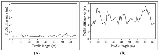 The UAS imagery was acquired almost seven months after the windthrow. However, in almost all target plots there were still downed trees. This influenced the reclassification of the raster layer made from the UAS DSM and ALS DTM subtraction. Within the subtraction raster layer, we established 50 m by 50 m polygons in the middle of each target plot and calculated the maximum and minimum values. The range of the differences varied between −2 m and almost 6 m. The negative values were mainly caused by skid trails in areas where the salvage logging had started. The positive values were caused by laying trees left within the plots. Figure 5 shows examples of elevation profiles from forest roads and the middle of the windthrow plot. We can clearly see the difference, caused by the trees laying within the disaster area.