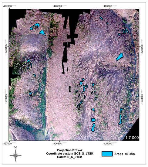 The other advantage of using UAS imagery is the ability to achieve a high resolution orthophoto map, down to a few centimetres, which makes it possible to identify small open areas within a forest. In some cases, it is not feasible to determine these spots during field mapping by GNSS, especially in cases when there are multiple spots within the area, and forest operators are busy handling the large damaged areas. In our case, we were able to detect the areas under 0.3 ha (Figure 6). The sum of these small windthrow areas was 2.28 ha. The average volume per hectare of the most represented tree species within the intersected forest stands was 350 m3. We can then assume that the salvage logging of the most represented tree species was approximately 798 m3. The ability to map small open areas within forest stands was also reported by [31]. The authors were able to identify crown gaps as small as 1 m2 using UAS imagery. On the contrary, recreational-grade and smartphone GNSS receivers have been reported to have difficulties with areas smaller than 0.5 ha [12].