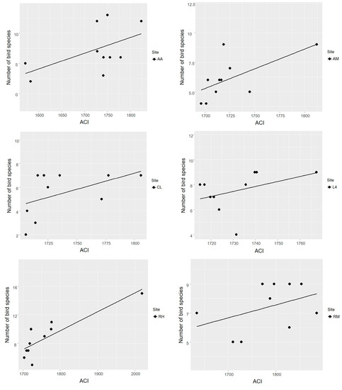 3.2. Acoustic Complexity Index as an Estimator of Bird Species Richness