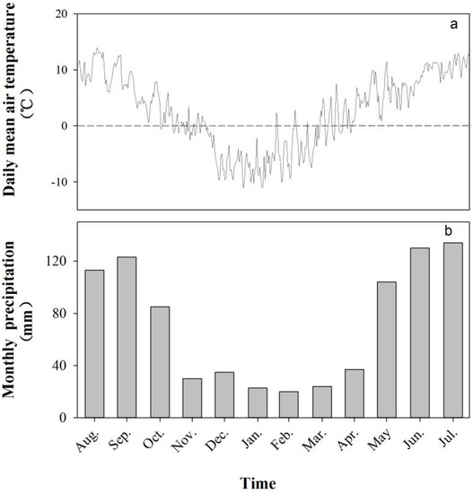 Daily mean air temperature (a) and monthly precipitation (b) in the sub-alpine coniferous forest on the eastern Tibetan Plateau from August 2015 to July 2016.