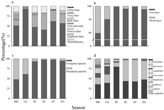 The seasonal dynamics of the production percentage of each litter component (a), tree versus shrub (b), evergreen versus deciduous (c) and the major species (d). MG: middle growing season, LG: late growing season, SF: snow-formation period, SC: snow-cover period, ST: snow-melting period, and EG: early growing season.