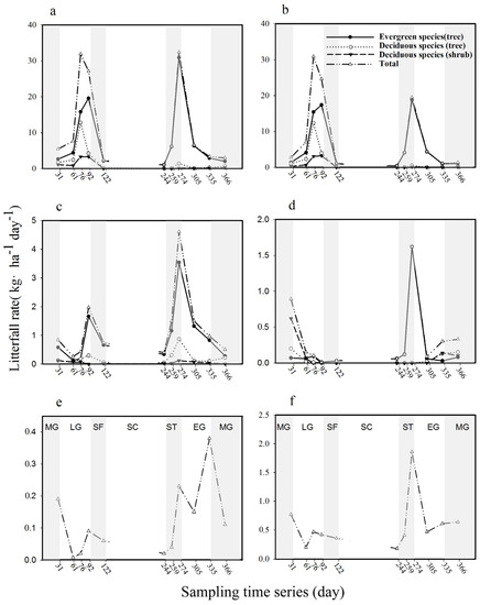 Significant seasonal patterns exist in different types of ecosystems and even for different tree species in the same ecosystems: the seasonal patterns of litterfall are unimodal, bimodal or irregular [9,14]. The seasonal dynamics of deciduous species are more obvious—peak litterfall usually occurs in autumn—whereas evergreen species generally do not show obvious seasonal dynamics [4,6]. However, different results have been observed for evergreen coniferous trees. For example, spruce-fir forest litterfall in the Xiaoxing’an Mountains is unimodal [19], Norway’s spruce forest litterfall is bimodal [20], and spruce-dominated and fir-dominated forests litterfall in the Wanglang Nature Reserve in western China are bimodal [17,18]. These field observations are clearly inconsistent, mostly due to climate factors (e.g., temperature, precipitation, snowfall or wind) or plant ecological characteristics (e.g., species, stand age) [6,8,14], and they result in large uncertainties regarding the temporal changes in coniferous forest litterfall, especially the dynamics among functional types (evergreen versus deciduous) and vertical structures (tree versus shrub).