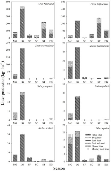 The total litter production was bimodal, with peaks occurring in April and October, and the minimum rate of litterfall occurred in the snow-cover period (Figure 3a).