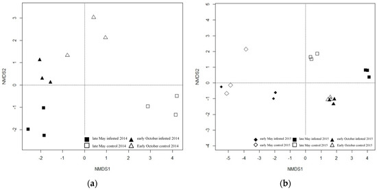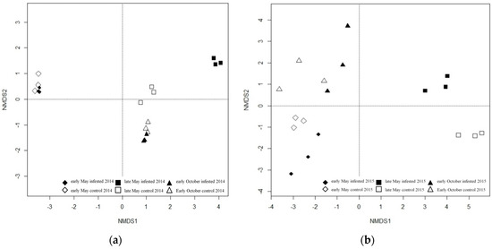 Non-metric multidimensional scaling ordination (NMDS) of Euclidean distance matrices of 18S rDNA denaturing gradient gel electrophoresis (DGGE) profiles of the phyllosphere fungal community of the L soil organic layer in 2014 (a) and Ol soil organic layer in 2015 (b).