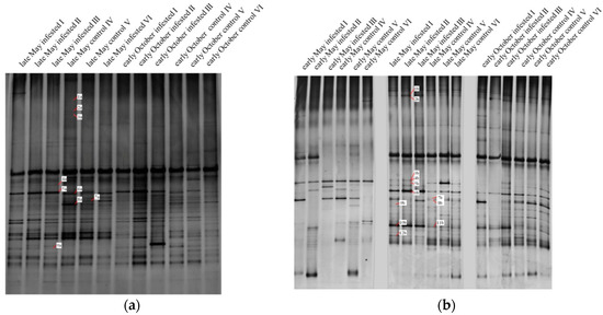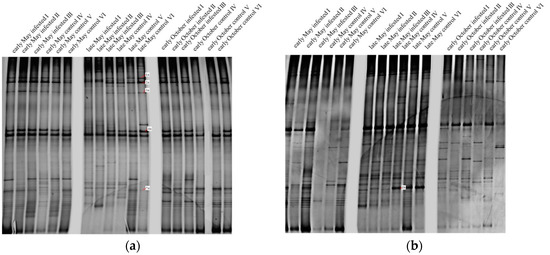 - Fromin, N.; Hamelin, J.; Tarnawski, S.; Roesti, D.; Jourdain-Miserez, K.; Forestier, N.; Teyssier-Cuvelle, S.; Gillet, F.; Aragna, M.; Rossi, P. Statistical analysis of denaturing gel electrophoresis (DGE) fingerprinting patterns. Environ. Microbiol. 2002, 4, 634–643. [Google Scholar] [CrossRef] [PubMed]