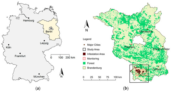 The state of Brandenburg in northeast Germany (a) and the infestation area with heavy foliage loss caused by Diprion pini L. in 2016 in the south of the state (in dark brown, (b)). The green shading in (b) represents the total forest cover of Brandenburg; the study area is marked by a square frame and a smaller area for demonstration of monitoring practice by a red rectangle.