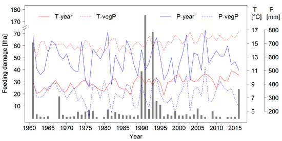 Forest area affected by feeding of Diprion pini larvae in the state of Brandenburg (hectares × 1000; columns) compared to mean temperature (T) and sum of precipitation (P) per year (solid lines) and per vegetation period (vegP; dotted lines) at the German Weather Service station Potsdam.