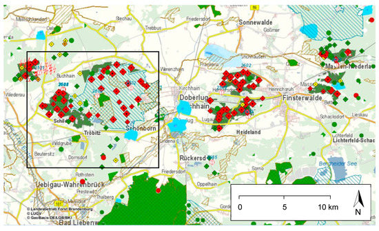 GIS documentation of monitoring data for Diprion pini in summer 2016 as threshold numbers (TN) deduced from found egg numbers. Red diamonds indicate a prognosis of total needle loss for the respective stands, green diamonds represent inconspicuous TN. The square in the left part of the map delimits the area shown in Figure 4.