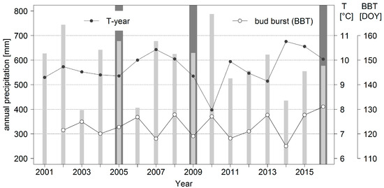 Annual sum of precipitation (bars), mean annual temperature (T-year), day of pine bud burst (BBT; DOY = Day Of Year), and years of mass outbreaks (dark grey columns) in the study area from 2001 to 2016. BBT was modeled from climate data according to Menzel [30]. Climate data originate from the German Weather Service station at Doberlug-Kirchhain in the center of the study region.