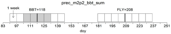 Construction of temporal variables of the selected climatic parameters. In this exemplary case, the acronym “prec_m2p2_bbt_sum” expresses that the variable is built by the total precipitation in the period beginning two weeks prior to and terminating two weeks after modeled BBT of P. sylvestris. The potential temporal range of variables is shown as weekly rectangles; the chosen time window is shaded in grey.