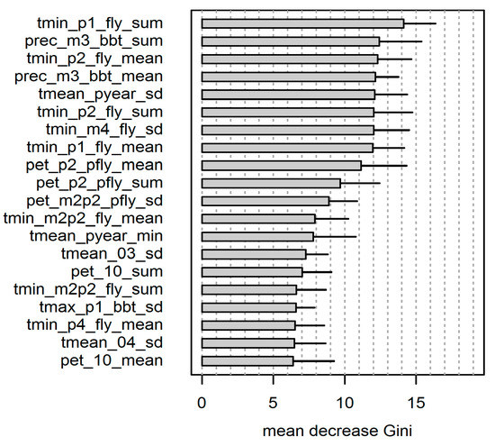 The 20 most important variables of the performed RF classification are shown in Figure 8. A description of the variable name abbreviations is given in Table 1. In the variable coding, the first character string defines the basic climate data and the last character string represents the applied metric (sum, mean, and standard deviation). The character string in-between describes the temporal reference which is defined either by the phenological dates BBT and FLY (Figure 7), the complete year or by single months as indicated by the numbers 01 to 12. Previous-year climatic conditions are labelled with “p”, e.g., “pyear” or “pfly”.