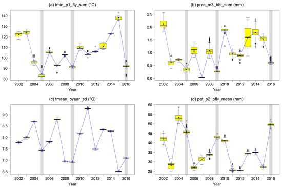 These top four trigger variables showed a clear differentiation for outbreak years by generally lower or higher values compared with the other years (Figure 9). For outbreak years, low minimum temperature at FLY and low precipitation at BBT can be observed. The particular previous years are characterized by low standard deviation of the mean temperature and high potential evapotranspiration at FLY. The correlations between the top four trigger variables were relatively low (Spearman’s rank correlation coefficient below 0.44) with the exception of tmin_p1_fly_sum and prec_m3_bbt_sum showing a rank correlation of 0.74 (Figure S1).