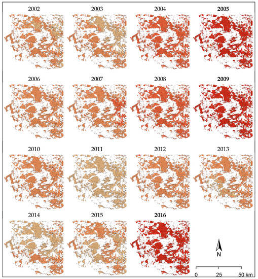 The last mass outbreaks of the D. pini in Brandenburg were observed in 2005, 2009 and 2016 with intensive feeding damages by a second larvae generation during late summer to the beginning of October (Figure 5). In 2016, almost 50,000 ha of Scots pine forest were affected; both the infestation area and the feeding intensity reached extremely large dimensions, verifying the predictions of larger outbreaks in the future. In the study area, a total of 23,000 ha—including areas where insecticides were applied—was damaged by significant (31–50% needle loss), severe (50–90% needle loss) and total (less than 10% of foliage remaining) defoliation (Figure 5).