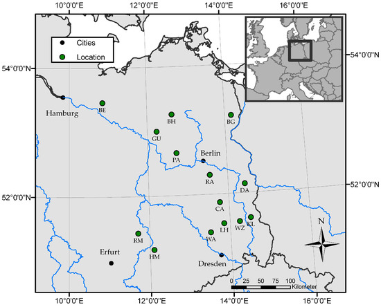 Map of the study area in Europe, indicating the 14 sampling sites (locations) in Germany of Robinia pseudoacacia L. [46]. For an overview of site abbreviations, see Table 1.