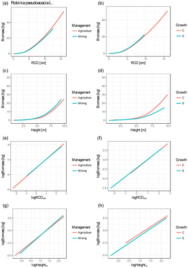 Land management in the past significantly influenced biomass production in the presence. The allometric models M01–M04 are based on the complete data set. Therefore, to obtain more precise results, the integration of the former land utilization (mining or agriculture) and growth by core or stump will improve model predictions. In terms of energy production in the past and present, Germany exhibits several former open cast lignite mines. Just recently, these disturbed landscapes are being restored and recultivated [78]. Within this context, black locust was planted as leguminous and modest tree species [9]. In this study, it was possible to compare previous mining with previous agricultural areas. In agricultural areas, the results showed that aboveground woody biomass is higher at the same RCD, so presumably the plants concentrate on vertical growth and biomass allocation. An assumption of this fact is that biomass accumulation at the equal RCD is higher if the tree height growth is superior. A reason for those results could be that tree height growth is strongly influenced by soil and site conditions. In this study, it seems that trees in former agricultural sites have better height growth than trees in nutrient poor former mining sites. In former mining areas, the biomass at the same tree height is higher than in agricultural areas. Probably, the tree growth in former mining areas is reinforced on radial growth and biomass allocation. Diameter growth is more influenced by competition for light, water, and nutrients in even-aged stands. The connection between diameter growth and competition is also indicated by the strong correlations between numbers of plants and RCD (DBH) in Table 4. Practitioners can apply the global models, but with increasing RCD and tree height the differences are not negligible. For example, the calculation of biomass with allometric models for mining and agriculture (Appendix, Table A1) showed a difference at an RCD of 9.0 cm of 3.3 tons per hectare (NoP 2000). In detail, the reasons for this different behavior are not yet clear and consequently more research is needed on the ecological reactions of black locust to different environmental conditions. However, it seems possible that a higher nutrient load in former agricultural sites may affect the relatively stronger vertical growth.