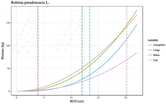 Biomass equations comparing Robinia pseudoacacia L. biomass to RCD of different investigations, including the current study M01, Lange et al. [41], Annighöfer et al. [42], and Böhm et al. [20]. The dashed line illustrates the maximum RCD, which was incorporated into the biomass equations.