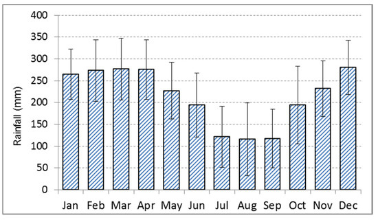 Mean monthly rainfall and standard deviation (mm) at Sampit, Central Kalimantan, Indonesia for 1901–2014 [22]. The climate data is a 0.5 degree resolution data grid for the years 1901 to 2009 produced by the Climate Research Unit of University of East Anglia, UK, and available online http://www.cru.uea.ac.uk/cru/data/hrg/cru_ts_3.23/cruts.1506241137.v3.23/).