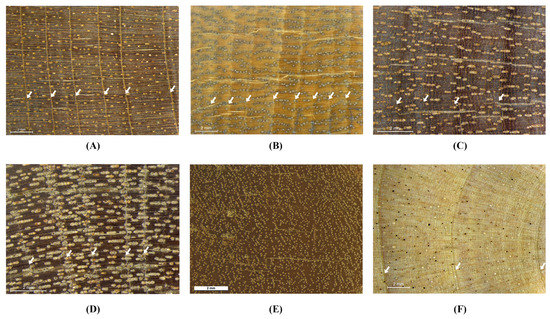 Growth zone types and distinctiveness of growth zones of different tree species from swamp forest (A–E) and a non-flooded site (F) in Borneo. The samples were polished and the photos taken with a microscope digital camera. The tree ring boundaries are indicated by arrows. (A) Horsfieldia crassifolia (marginal parenchyma bands, distinct); (B) Diospyros evena (density variations, distinct); (C) Palaquium ridleyi (pattern of changing fiber and parenchyma tissue, distinct); (D) Tetramerista glabra (varying vessel distributions and parenchyma pattern, distinct); (E) Tristaniopsis grandifolia (indistinct); (F) Hevea brasiliensis (parenchyma pattern, distinct).