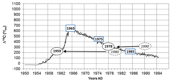 - Nydal, R.; Lövseth, K. Tracing Bomb 14C in the Atmosphere 1962–1980. J. Geophys. Res. 1983, 88, 3621–3642. [Google Scholar] [CrossRef]