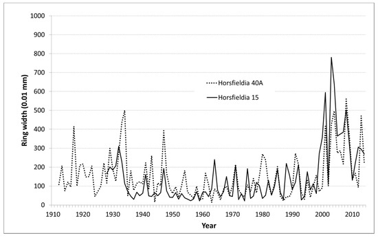 Having confirmed the annual nature of the parenchyma bands in Horsfieldia, we measured the ring widths of all samples of this species and those of Calophyllum hosei, Magnolia bintuluensis and Knema intermedia, all having a similar growth zone anatomy and structure. All tree ring curves showed year-by-year variations which can generally be traced back to climatic variability [28]. The similarity of these variations between different samples is expressed in % parallel run (PR) and serves in a first step as a validation of the quality of the measurements. As an example, two Horsfieldia curves from different individuals show a significant congruence of 65% PR (Figure 6). The same is true for the Horsfieldia (H15), the Calophyllum and the Magnolia curves. In a second step, we built an average chronology for Horsfieldia and cross dated this with different precipitation time series. A significant similarity is given for the annual precipitation and the precipitation in the dry season (Table 3).